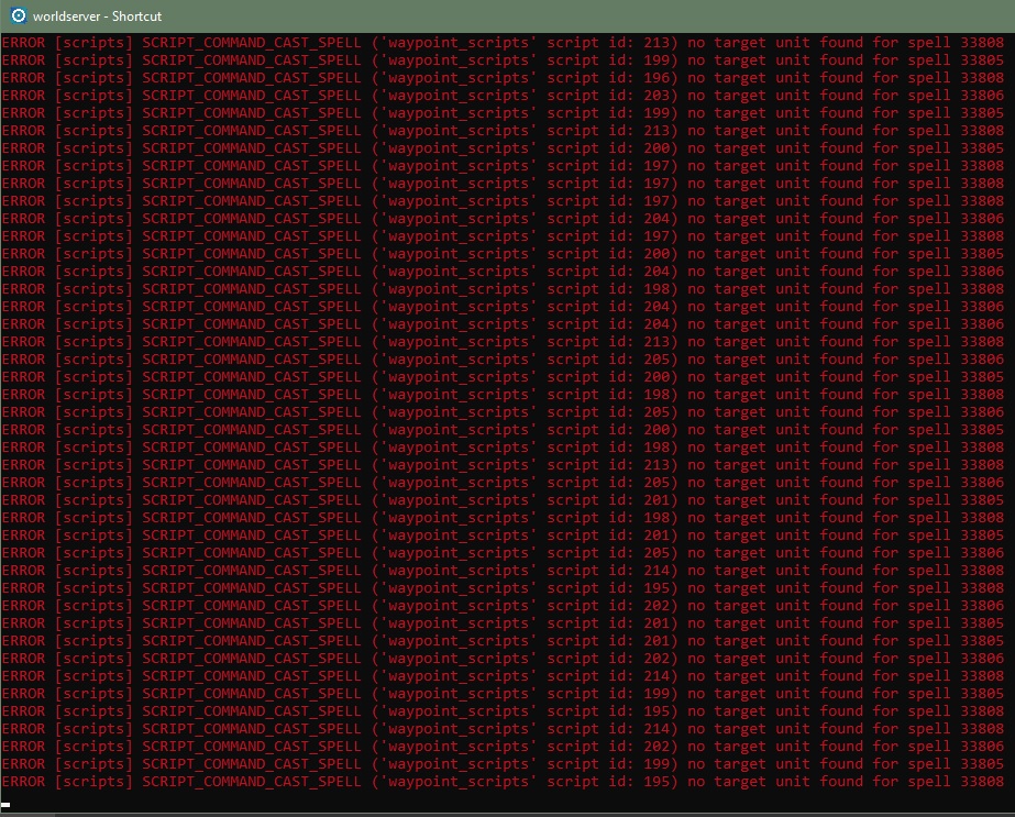 ERROR [scripts] SCRIPT_COMMAND_CAST_SPELL ('waypoint_scripts' script id: 195) no target unit found for spell 33808